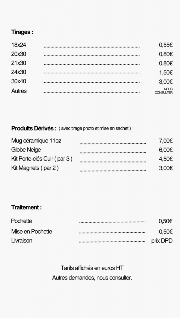 Pas de temps pour la mise en pochette, nous l’assurons pour vous. Pas de temps pour les tirages, nous sommes là pour ça. Consacrez-vous à vos clichés, on s’occupe de votre production. «